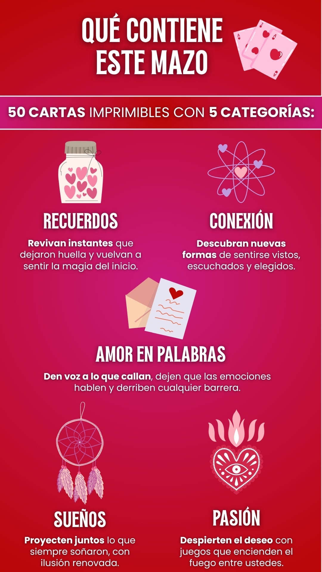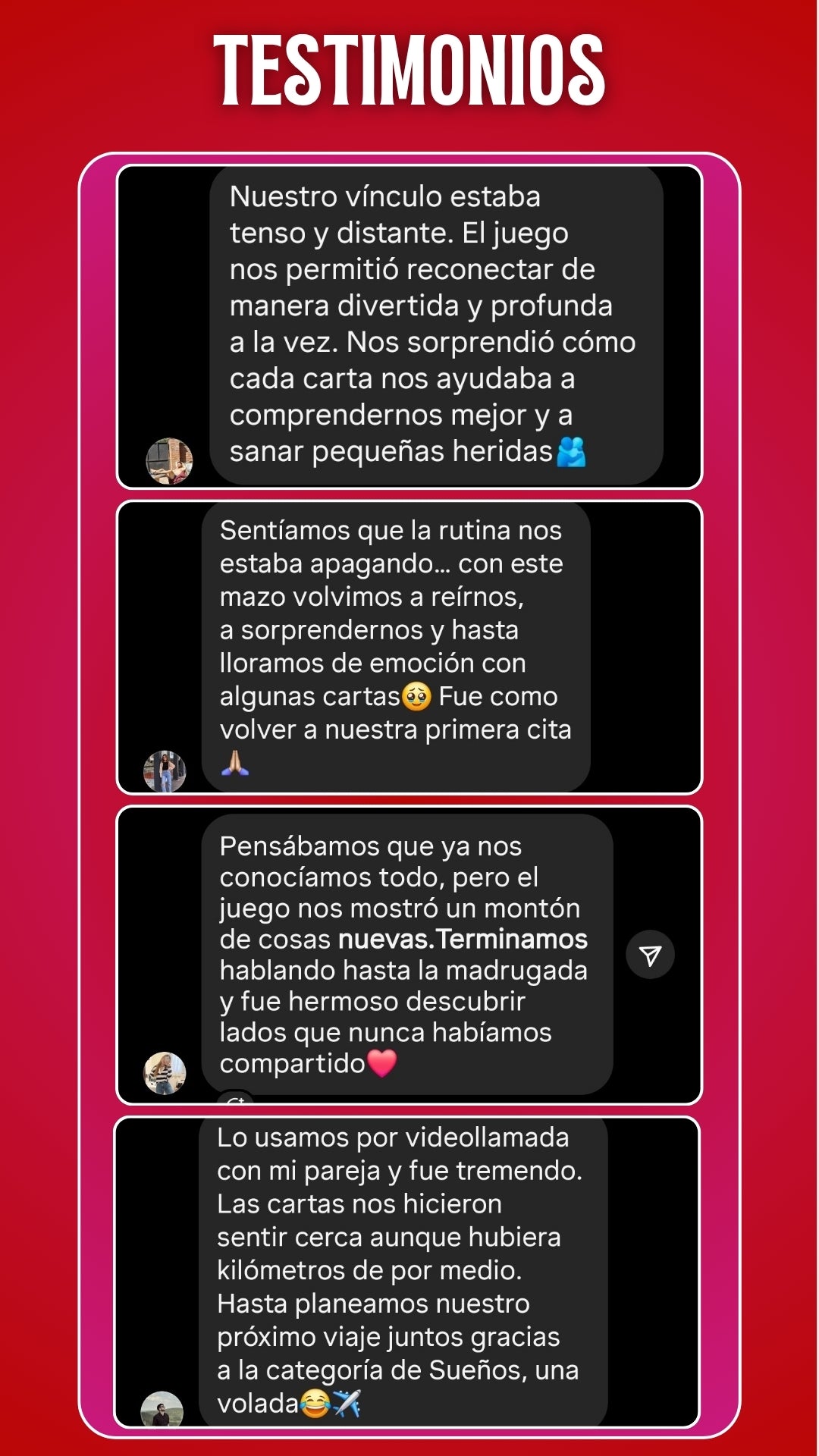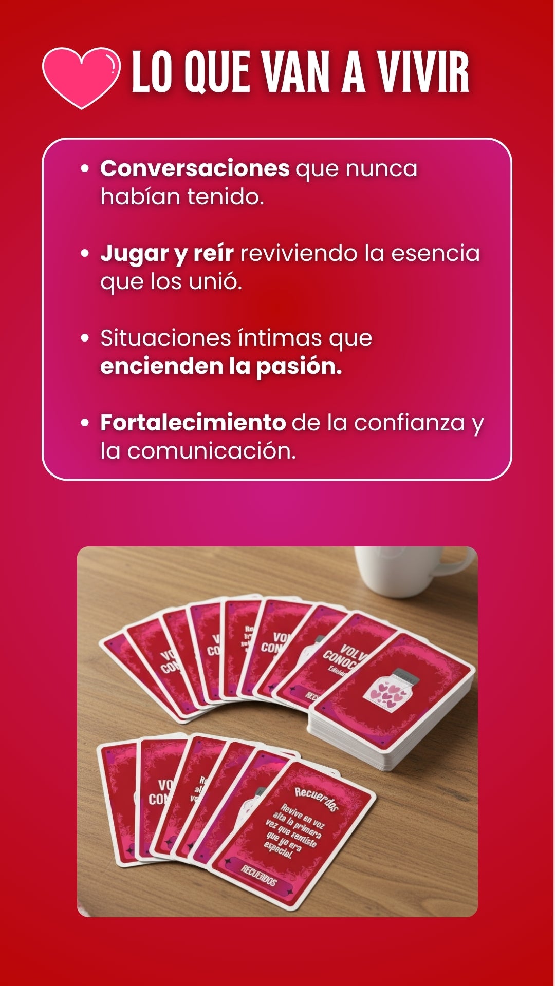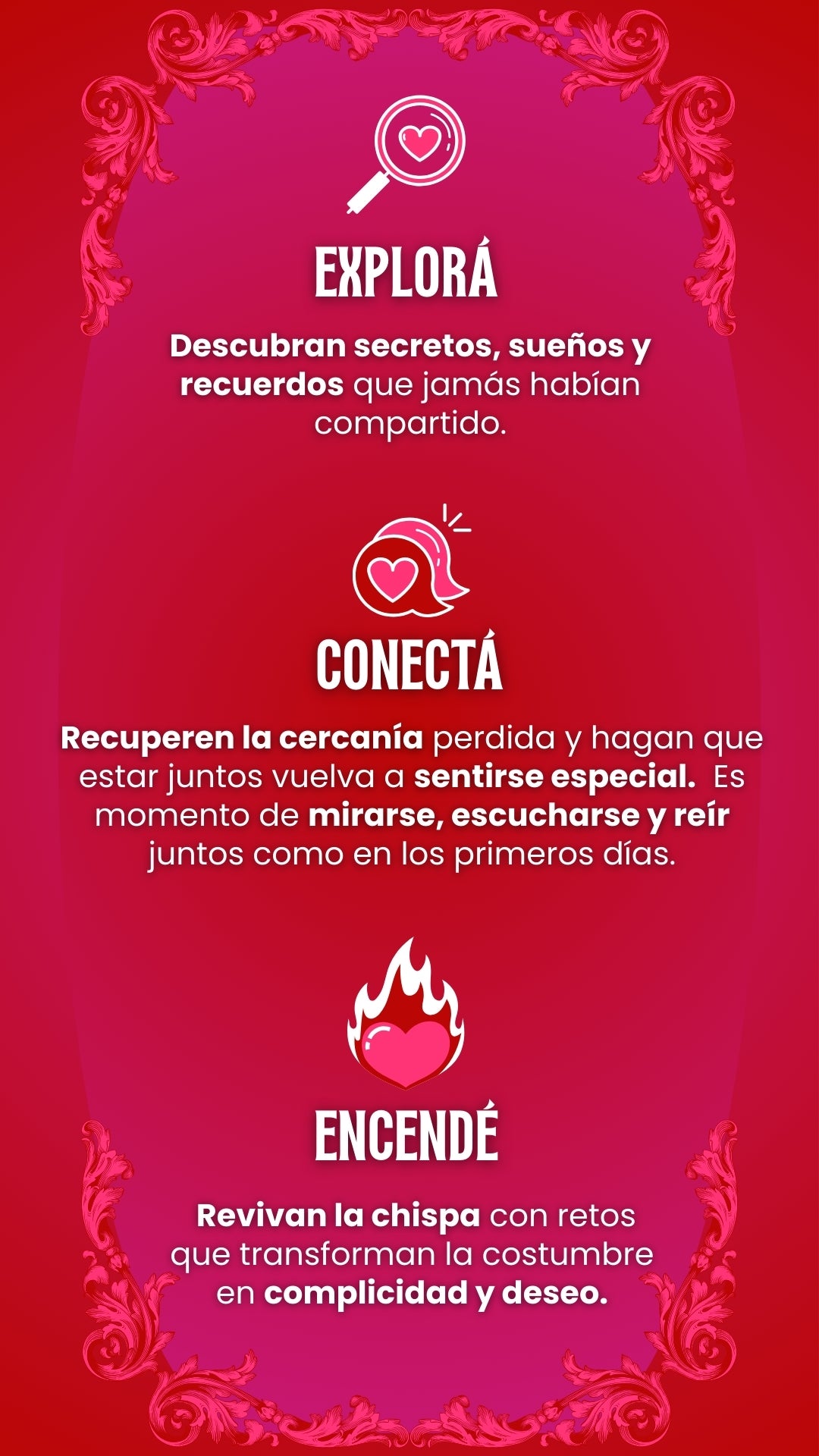 - Seguí las instrucciones incluídas y disfruta de la experiencia para reconectar con tu pareja.